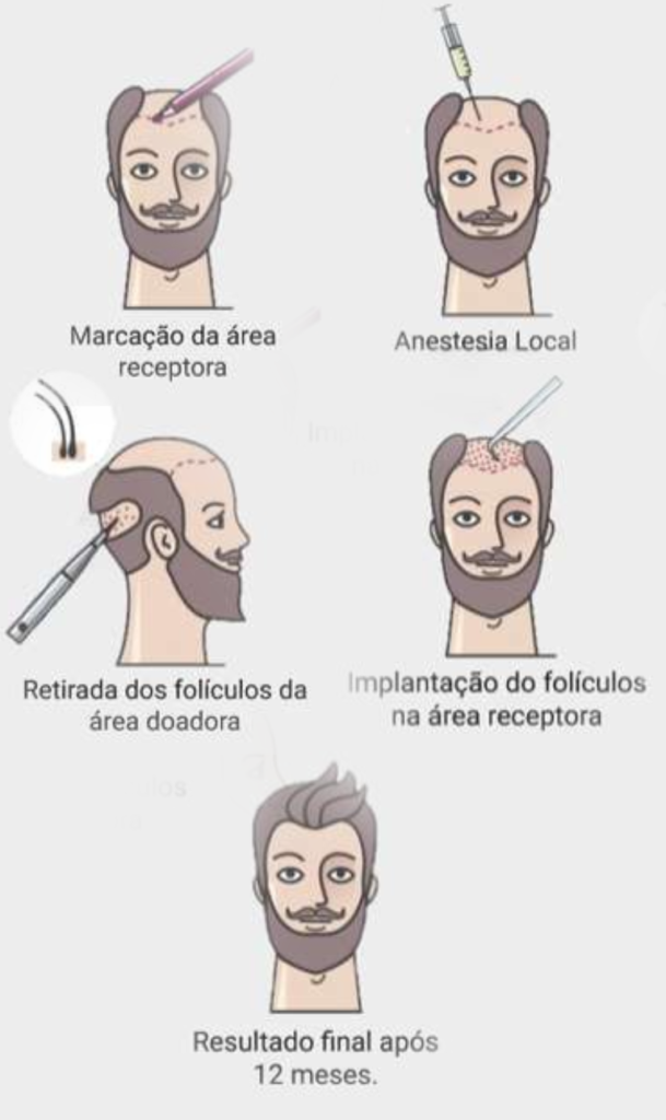 De maneira sucinta o transplante capilar retira folículos capilares de área doadora segura e mais cheia ( parte de trás e do lado da cabeça) , que são geneticamente programados para crescer pelo resto de sua vida (não sensíveis ao DHT), este cabelo usualmente mais volumoso é colocado de maneira permanente e crescerá naturalmente nas áreas calvas do couro cabeludo.